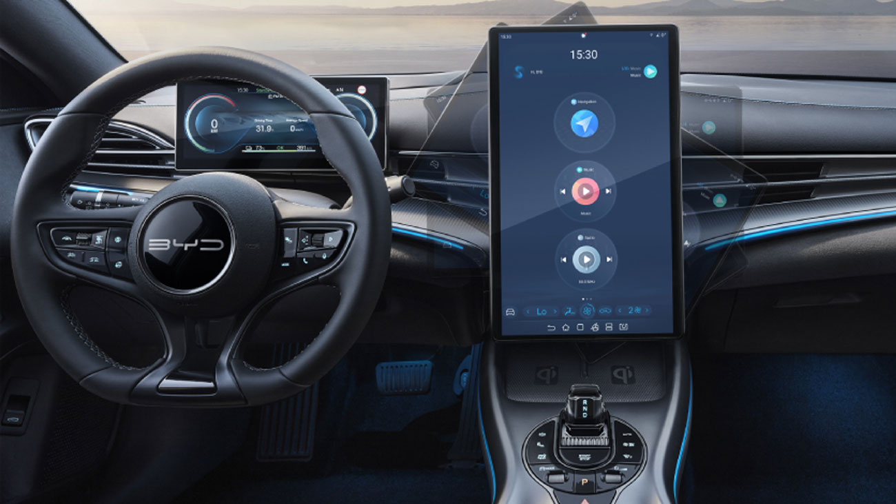 Khu vực trung tâm được trang bị màn hình cảm ứng với kích thước 15,6 inch, có thể xoay ngang hoặc dọc, giúp người lái tận hưởng trải nghiệm công nghệ đầy thú vị.